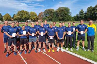 In der vergangenen Woche fand nun das letzte Training der Feuerwehranwärter statt. Nach einer abschließenden Feedbackrunde, die durchweg positiv ausfiel, konnten die zukünftigen Feuerwehrbeamten ihre Sportabzeichen-Urkunden offiziell entgegennehmen. Damit bildete die Kooperation zwischen Feuerwehr Rheine und der LG Rheine-Elte einen wichtigen Baustein in der 18-monatigen Ausbildung der Feuerwehranwärter.